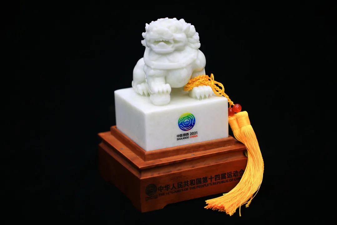 全运会宝玺(蓝田玉文化博物馆供图)这尊全运会宝玺以站立雄狮手工雕刻而成,印面正中刻有全运会会徽标识,章印正面是彩色全运会会徽标识,表达了全运会庄重、和谐的盛世辉煌。每方全运会纪念宝玺都刻有唯一的收藏编号。印面为100毫米×100毫米,寓意着中国共产党成立100周年。体现了两个100年,宝玺高140毫米,意指第十四届全运会,也指十四亿中国人民站起来了。另外,雄狮高90毫米,印章高50毫米,象征着九五之尊。