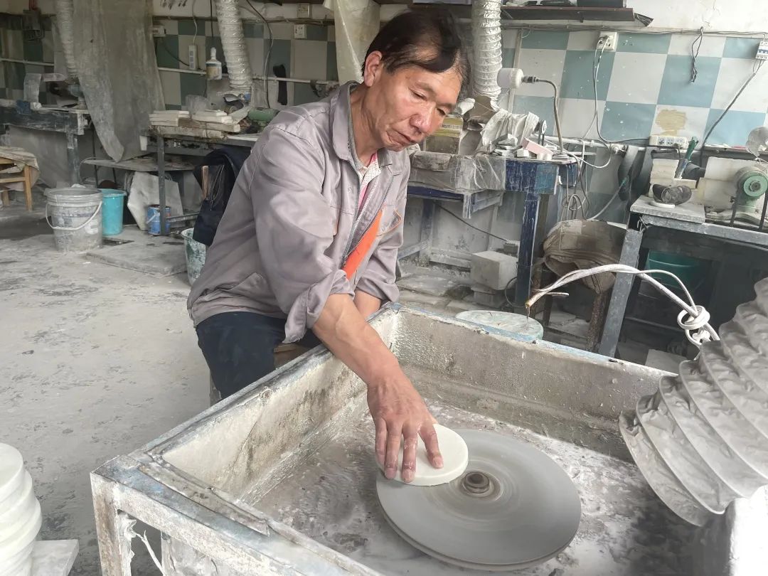 金鼎蓝田玉雕工人正在打磨玉器“要是以前,这些小料早就扔掉了,但现在都成了宝贝。没有新的料子来源,所有的加工都靠原先的屯料。但是料子总归是用一块少一块,所以必须充分运用这些小料,稍大一点的可以做牌子、平安扣,小料可以车珠子,总之每块料子一丁点都不会浪费。”瞿文君指着一堆堆的小料说。