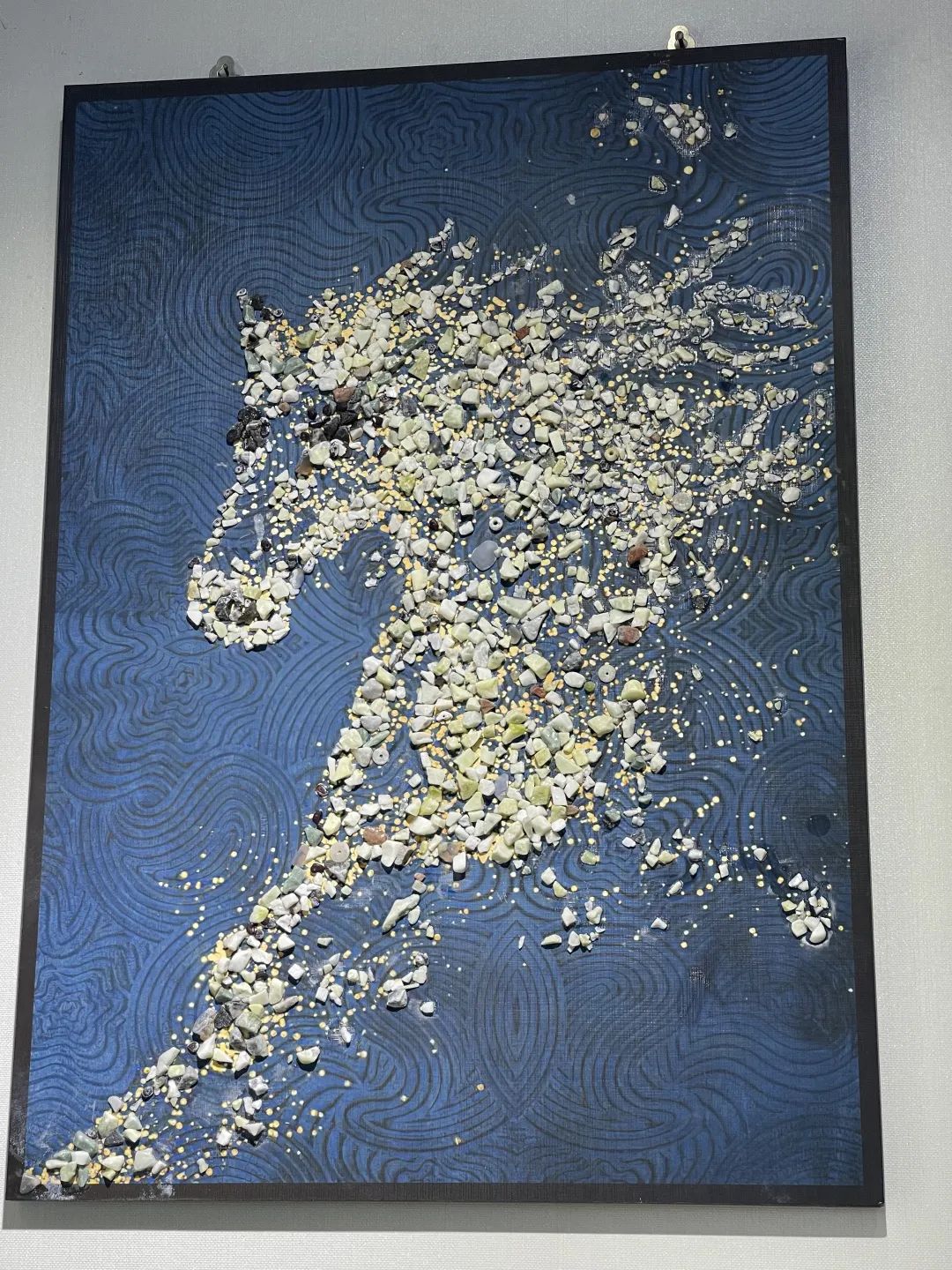 用蓝田玉渣做的飞马造型玉石画代策工作室挂了一幅飞马造型的作品,就是用各种碎玉做的。是那种让人看一眼,就有股冲动想买下的文创作品。