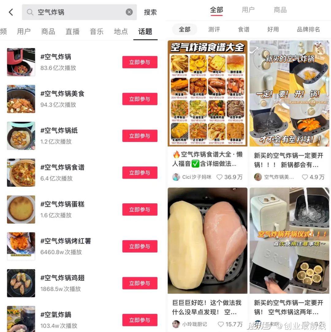 据「创业最前线」了解,截至6月7日,抖音上#空气炸锅#话题有83.6亿次播放,#空气炸锅美食#话题有94.3亿次播放;在小红书上,关于空气炸锅则有超过108万篇笔记。