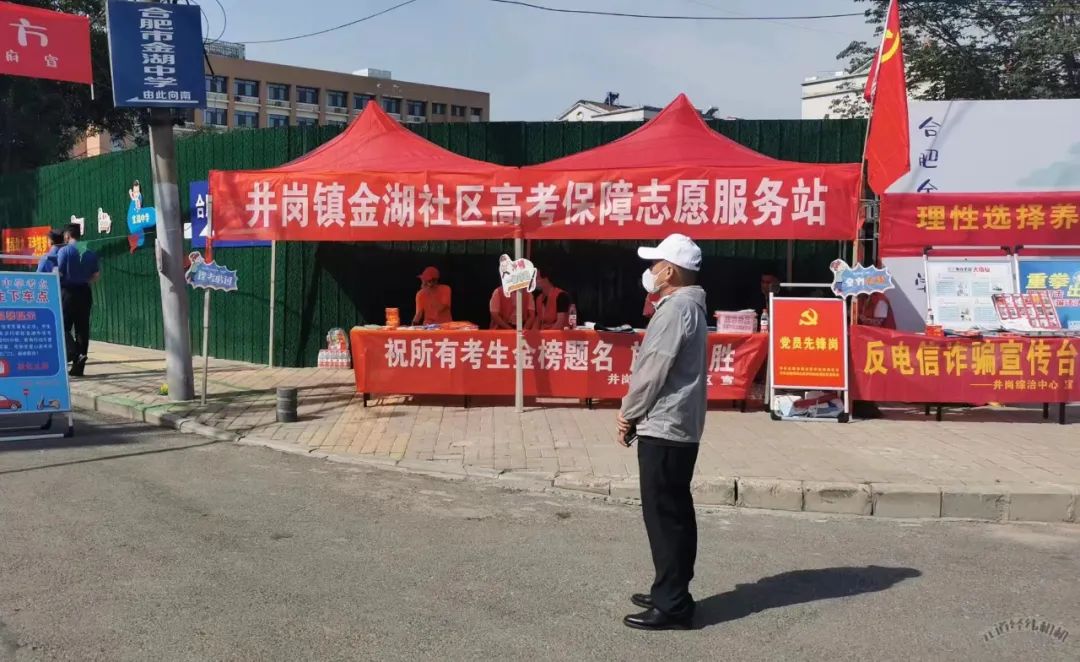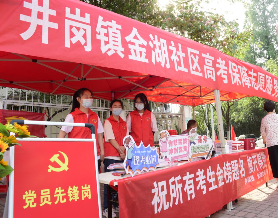 井岗镇金湖社区设立高考保障志愿服务站。除此之外,井岗镇兴民社区春雨爱心服务车队的100余名党员,投入到爱心送考活动中,通过电话预约或遇有“爱心助考”车贴的车辆,可凭准考证免费乘车前往考点;金湖社区党委组织6名党员组成爱心送考车队,为有需要帮助的考生提供免费接送服务。