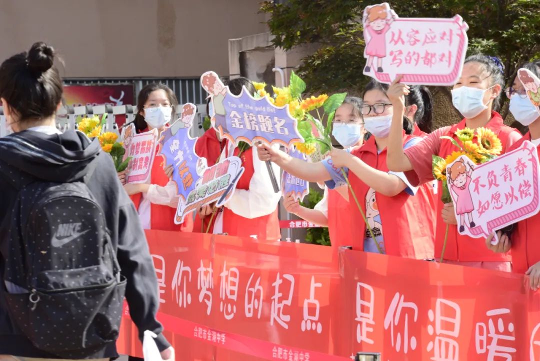 在井岗镇金湖社区金湖中学考点,志愿者为考生加油。为保障考生有序到达考点,井岗镇和金湖社区在距离考点200米外的希望路等3个路口进行交通管制,并设置了4个志愿服务站点,准备了饮用水、防暑等物资,辖区企业还为送考家长提供了223个免费停车位,考点现场有40多名党员志愿者为学生和家长提供引路、咨询、应急等服务。