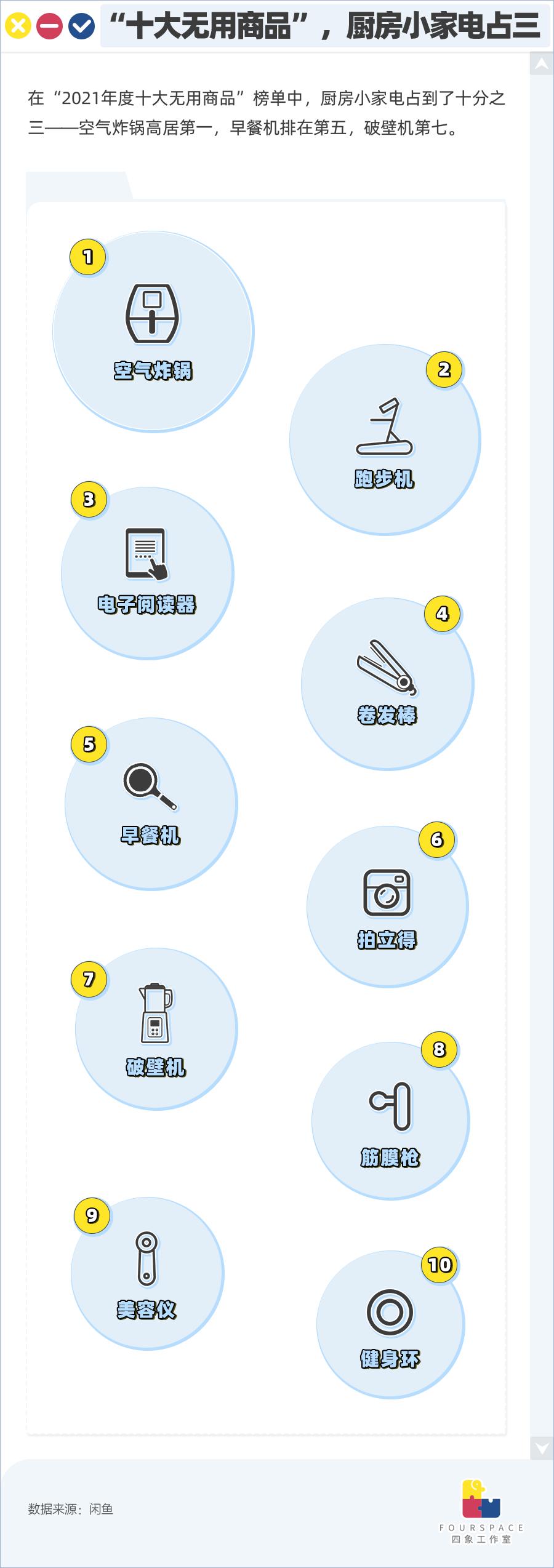 在闲鱼“2021年度十大无用商品”榜单中,空气炸锅“荣获”第一名,说明空气炸锅的风虽大,在美食博主手里玩出了花来,但你买回家后,可能只会在朋友圈出现一次。