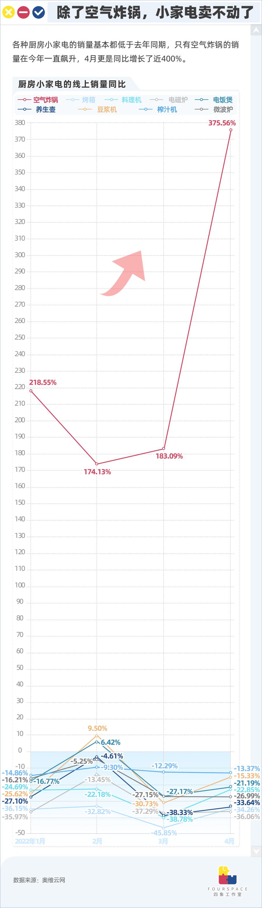 数据显示,今年大多数厨房小家电的销量都在下滑,电磁炉、烤箱和养生壶的销量在4月都同比下降了超过30%,唯有空气炸锅逆势而行,销量暴涨近400%。