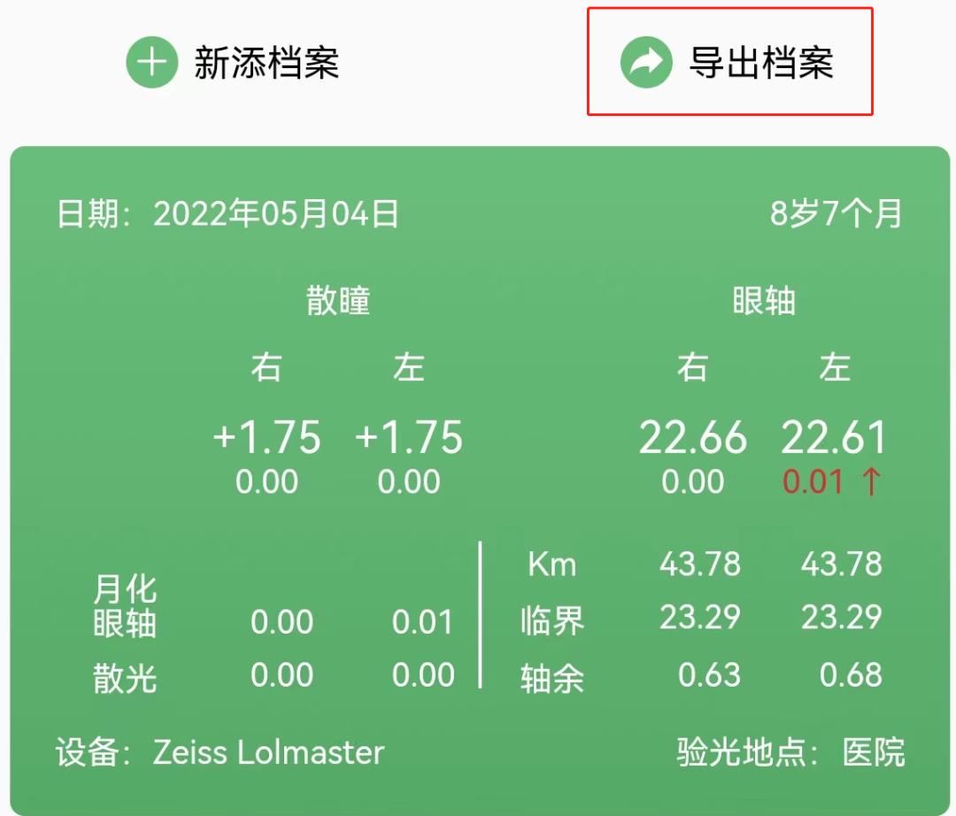 电子视力档案不仅仅是电子化的视力档案,除了帮助整理数据之外,还可以计算近视到站眼轴,剩余眼轴,这是很重要的参考数据,很难靠医生脑算,得用软件根据大数据才能算的出来。此外还可以使用“导出档案”功能,导出下列汇总表,分享给医生,近视防控的关键数据一目了然。