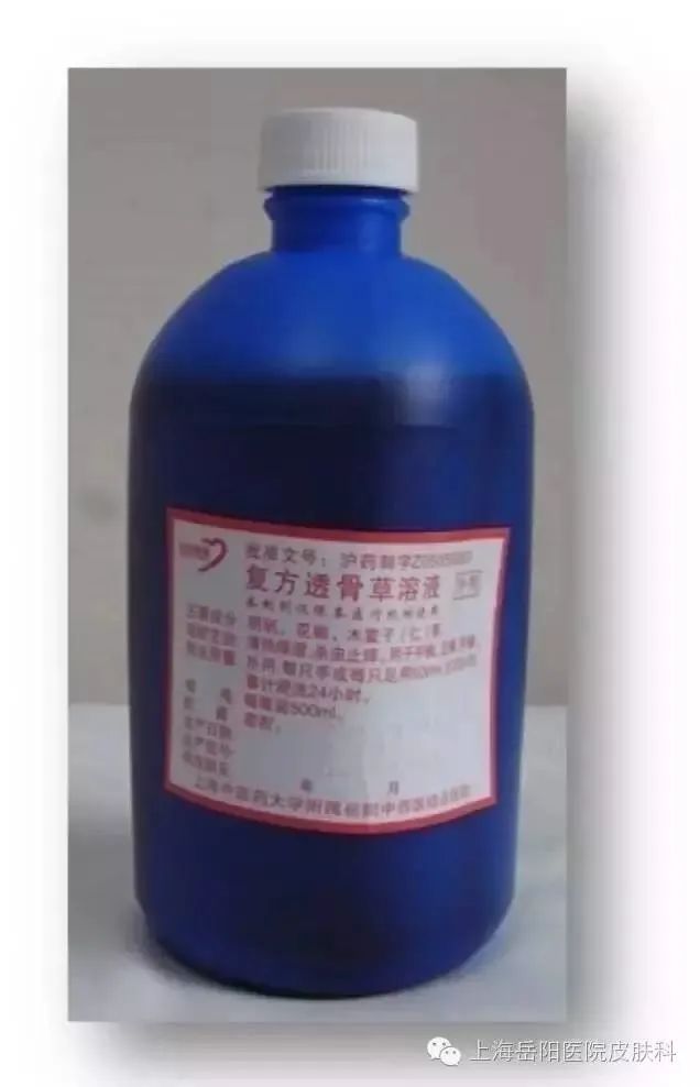 “复方透骨草溶液”是我院院内自制中药制剂,其药物组成主要有透骨草、花椒、皂荚、黄精等,具有清热除湿、杀虫止痒等功效,通过浸泡治疗后,可软化角质,是夏季治疗角化型手足癣以及治疗手足干燥、脱屑、皲裂等的特效药物。