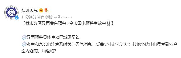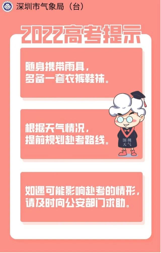 2、目前我市暴雨橙色预警生效中,高考考生应留意招考办相关考试信息,其他年级中小学以及幼儿园学生应参照《深圳市教育局关于印发台风暴雨高级别预警分时段学校防御指引(2017年修订版)》的通知要求做好防范。