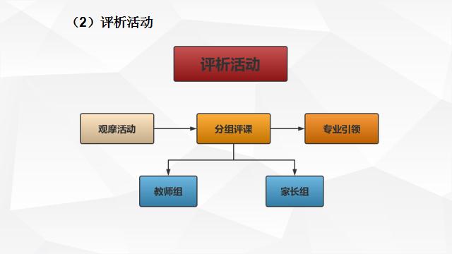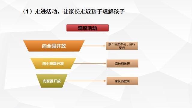 向家长开放观摩活动,开放规模从家委会代表到家长小组,再到全园,逐步扩大;邀请家长深入教研一线评析活动,分家长组和教师组开展讨论,让家长参与幼儿园教育活动,通过活动观察与研讨,进一步理解幼儿、尊重幼儿。