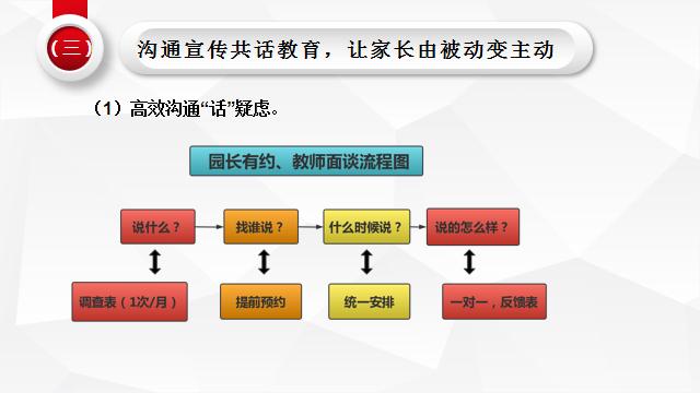 1.高效沟通“话”疑虑。为解决家长育儿困惑,开设“园长有约”“教师面谈”等通道,沟通形式、时间、问题、对象均由家长自主选择,引导家长来园主动对接,主动交流教育问题。