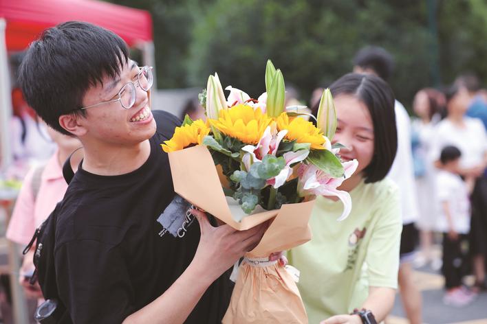 2022年高考结束后,考生陈思旭走出考场就收到意外的惊喜——表妹送的鲜花,开心得合不拢嘴。李杰 摄