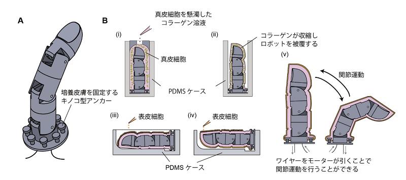 这款机器人由東京大学竹内昌治研究团队研发,是手指形状。灵活的机械关节外,包裹有一层真皮组织、一层表皮组织。真皮表皮均由人体皮肤细胞培养而成,厚约1.5毫米,在手指活动时,培养皮肤不会撕裂和移位,附着性良好。