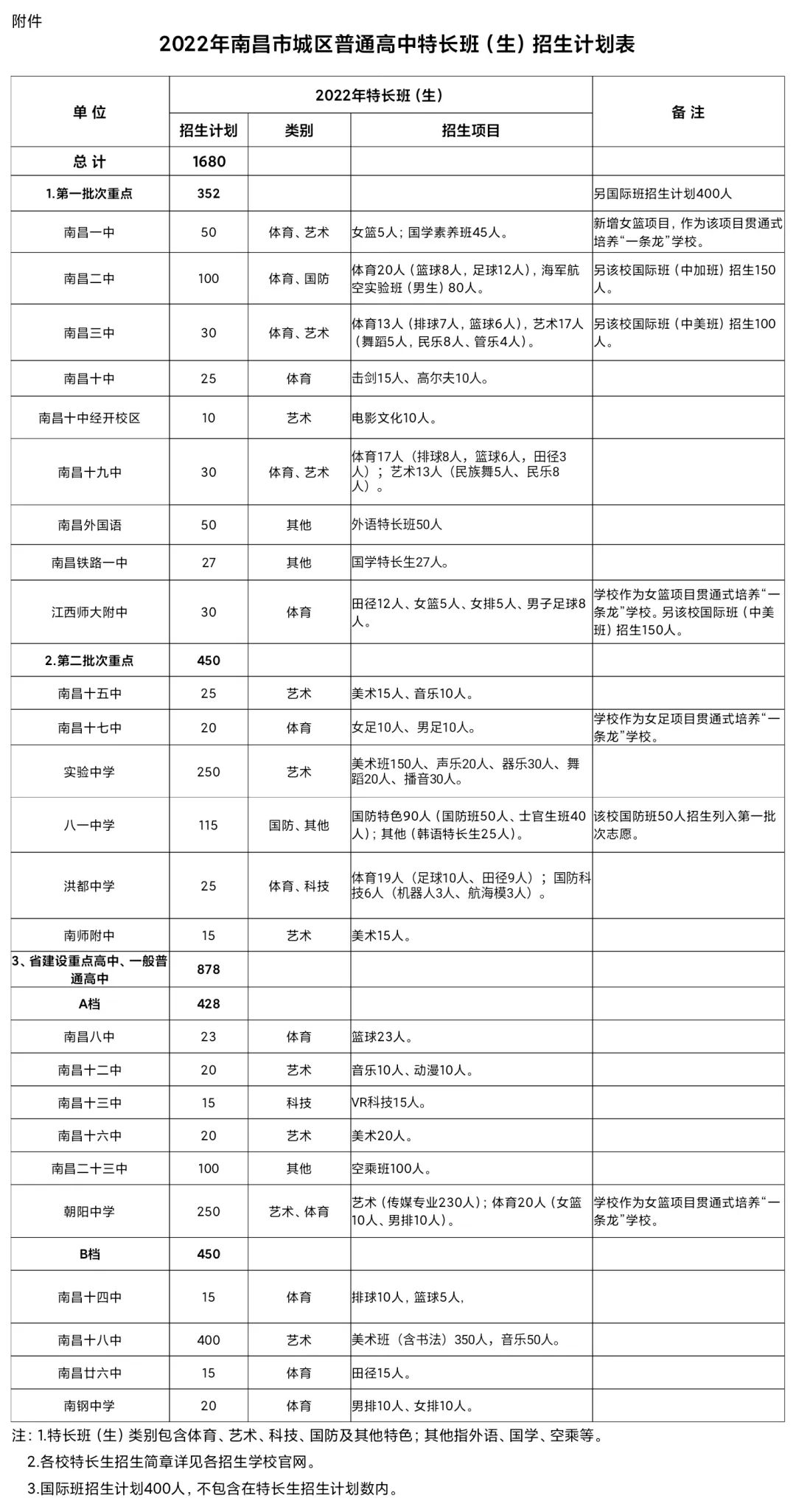 根据《关于做好2022年全省普通中小学招生入学工作的通知》(赣教基字〔2022〕15号),为推动我市普通高中特色发展,满足不同潜质学生的发展需要,促进学生个性和潜能发展,经学校申报、市教育局认真研究,现将2022年城区普通高中学校特长班(生)招生项目及计划予以公布。