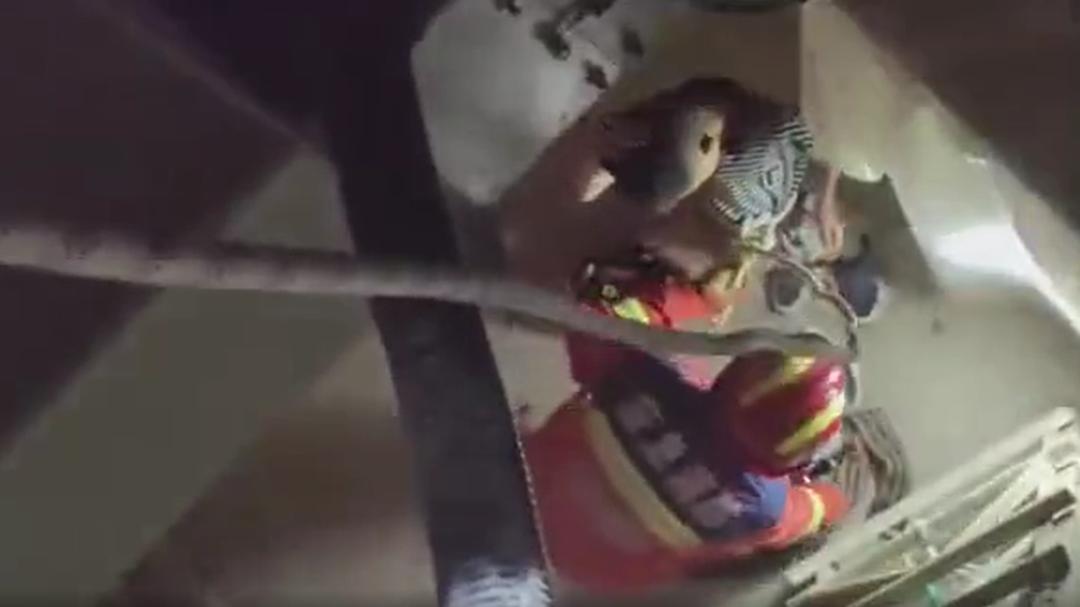 消防员首先利用拉伸梯,将负一层的熊孩子救出。