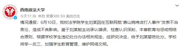 西南政法大学法学院学生刘某因就“唐山烧烤店打人事件”发表不当言论,被给予警告处分。