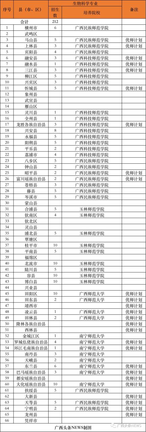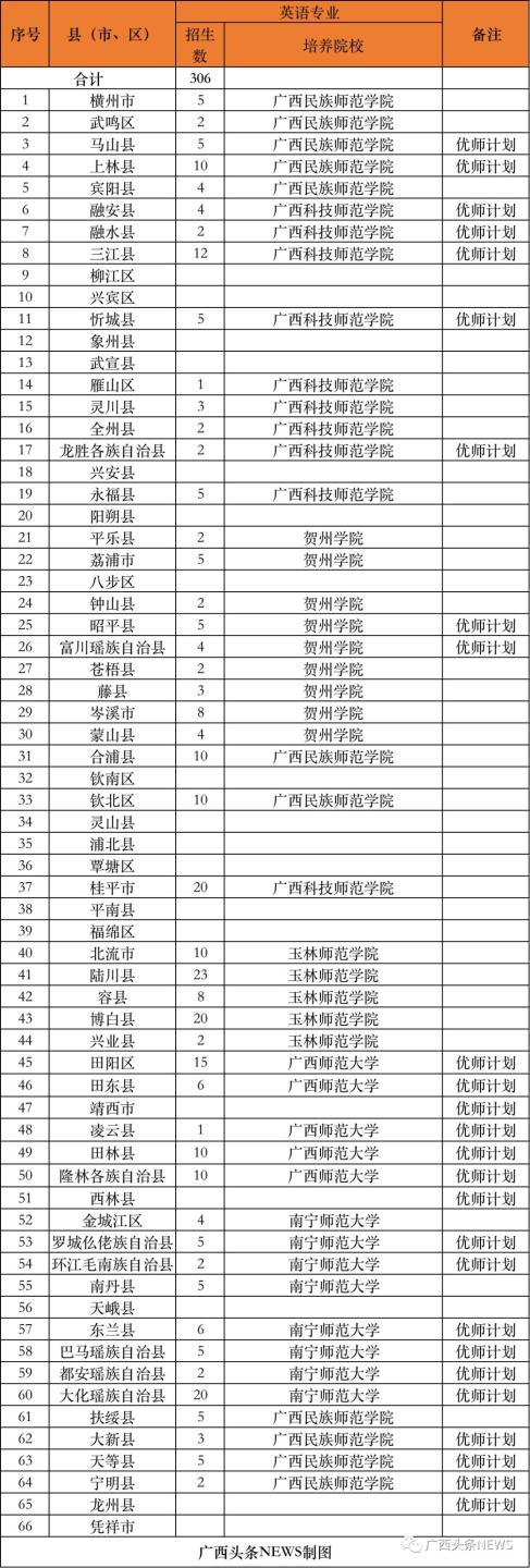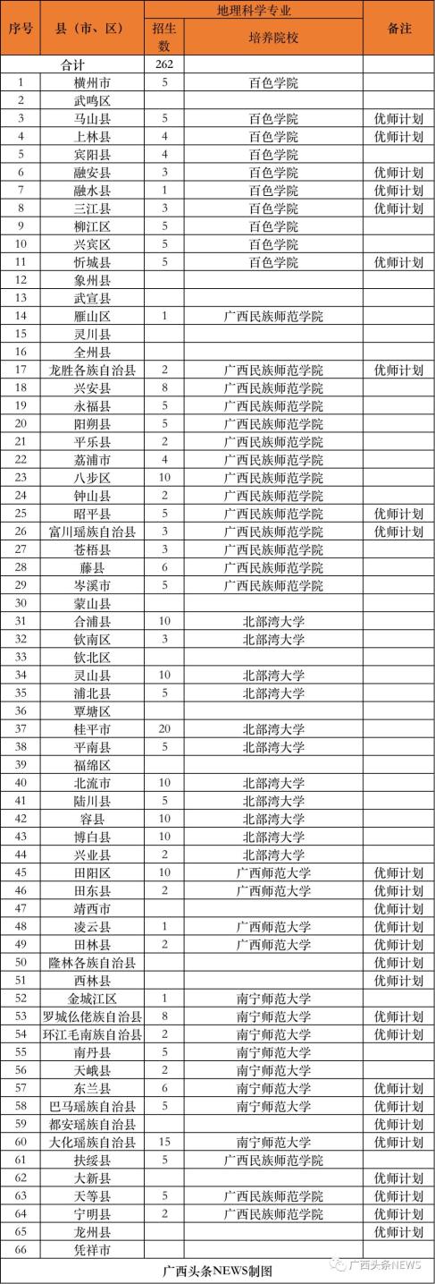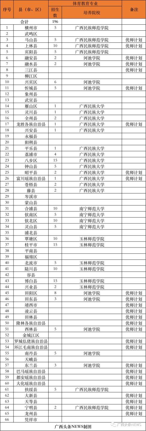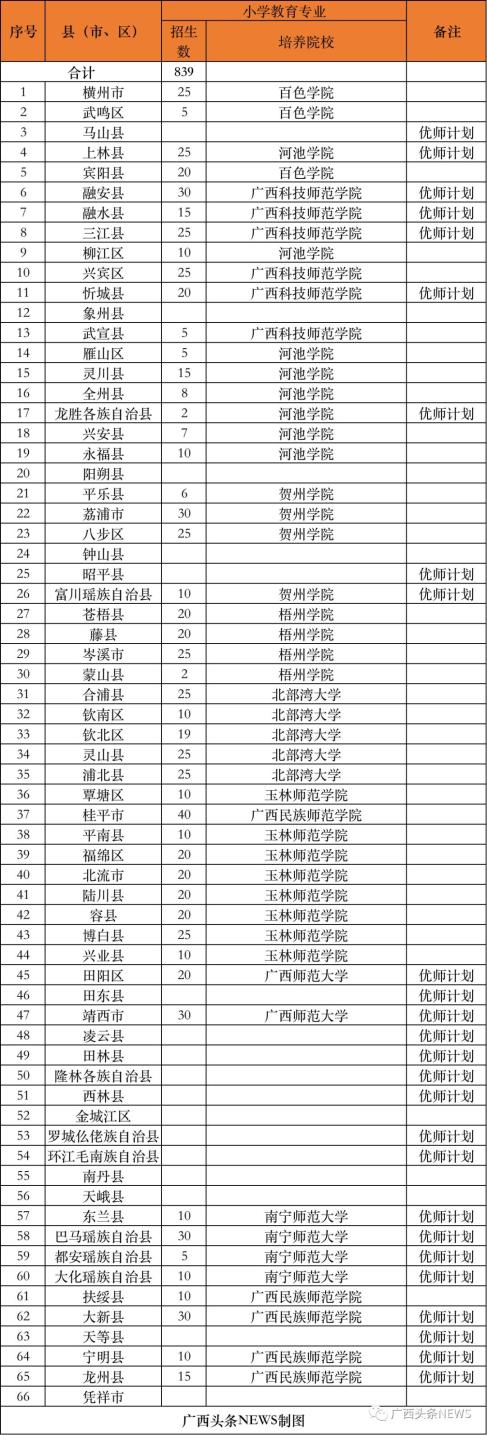 (二)培养院校。实行分片区委托培养,今年培养院校为广西师范大学、南宁师范大学、广西民族大学、北部湾大学、玉林师范学院、河池学院、百色学院、贺州学院、广西民族师范学院、广西科技师范学院、梧州学院、广西幼儿师范高等专科学校、桂林师范高等专科学校等13所院校。