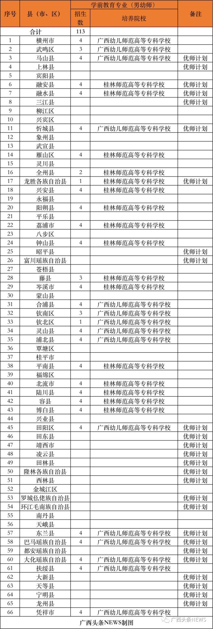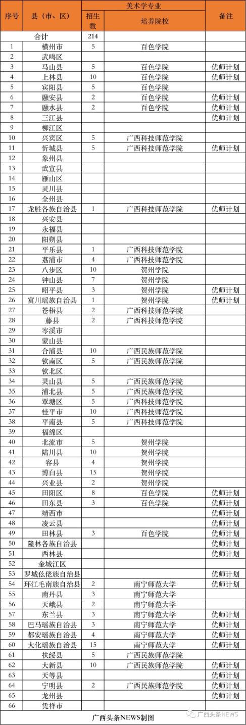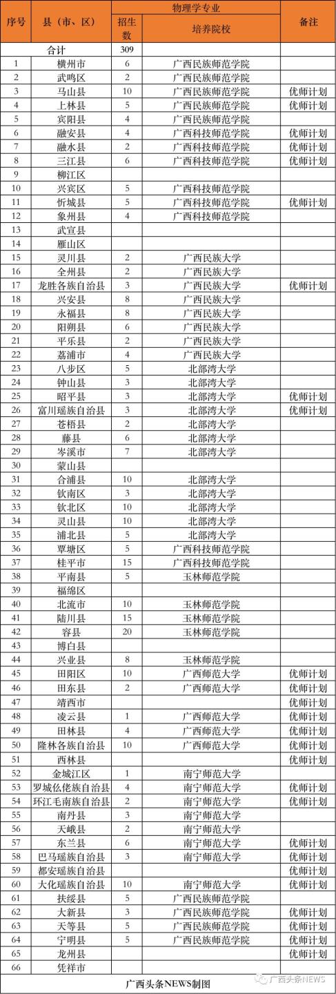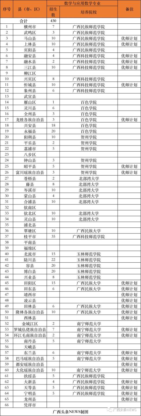 (二)培养院校。实行分片区委托培养,今年培养院校为广西师范大学、南宁师范大学、广西民族大学、北部湾大学、玉林师范学院、河池学院、百色学院、贺州学院、广西民族师范学院、广西科技师范学院、梧州学院、广西幼儿师范高等专科学校、桂林师范高等专科学校等13所院校。
