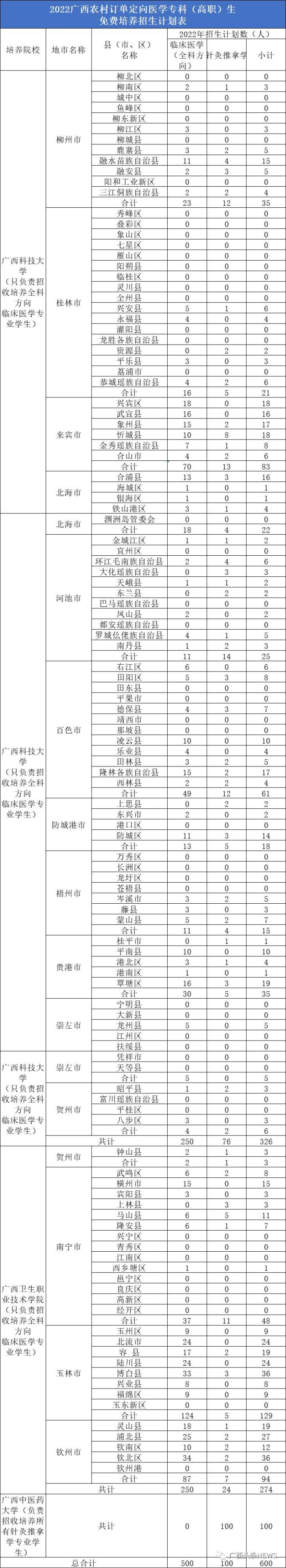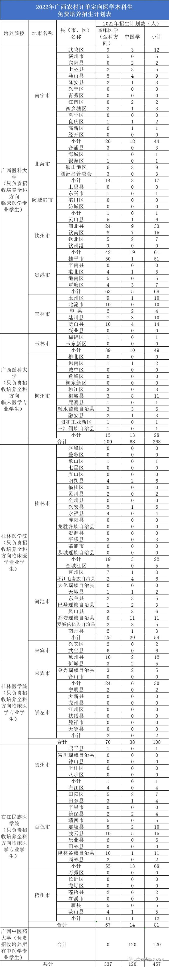 资料图片 来源:微信平台公共图片库据自治区卫生健康委员会消息,2022年,广西继续实施定向医学生免费培养项目,面向全区招生。全区共有1057个名额,其中,本科457个,专科600个,培养院校分别为:广西医科大学、广西中医药大学、广西科技大学、桂林医学院、右江民族医学院、广西卫生职业技术学院。