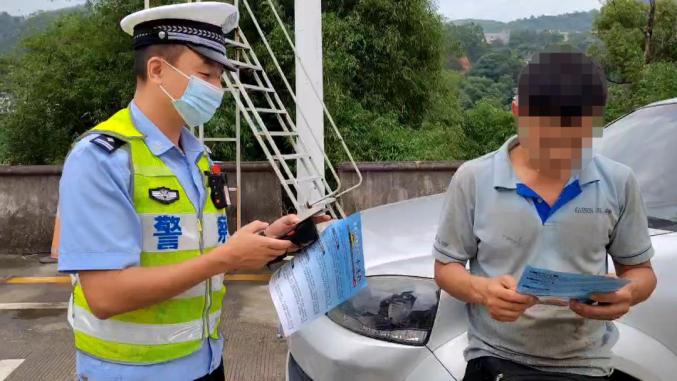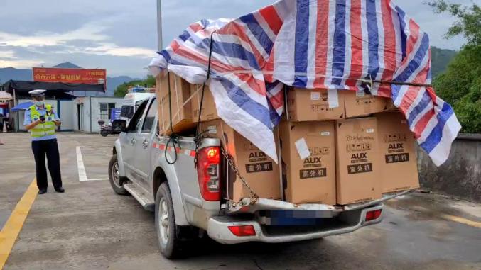 6月5日17时许,宁德高速交警支队三大队民警在福安收费站出入口执勤时,发现一辆轻型载货汽车存在载货长度超过规范的违法行为,后车厢装载的货物延伸出车尾部,后方仅靠一根纤维带固定。行驶过程中,纤维带一旦断裂,可能导致货物掉落路面,引发事故。