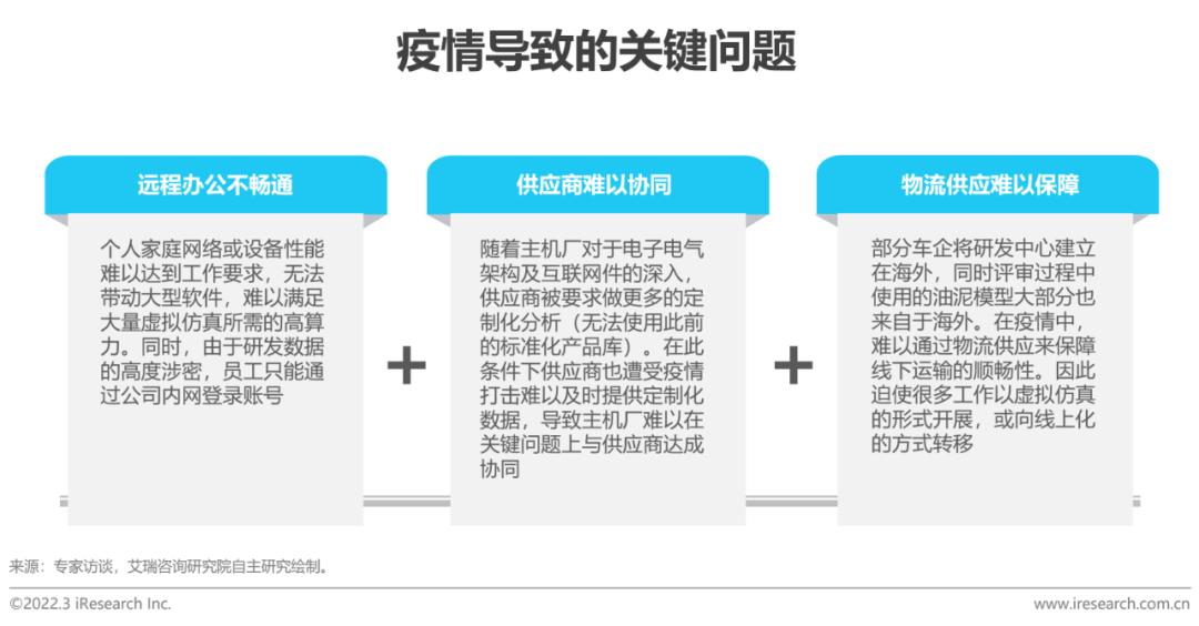 物流与供应链:在车企全球化布局的背景下,疫情难以保证零部件和其他实体物料的及时供应,导致部分物理实验被迫停滞,车企被迫应用更多的虚拟验证手段来应对线下供应链的断裂。