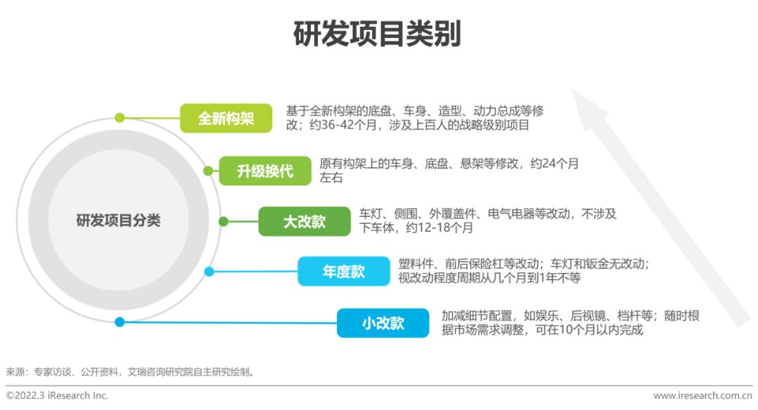 整车产品研发类别:包含小改款、年度款、大改款、升级换代和全新构架项目,是以满足用户需求为根本目的的针对性产品迭代。