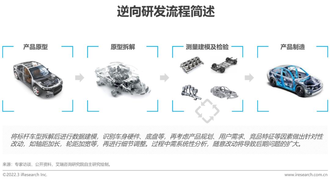 逆向研发源于逆向思维,将原有产品进行拆解、测量、分析得出数据,在原有的结构、造型上进行再次开发从而得到全新产品,降低研发成本和风险。我国汽车工业起步时期经历了从零到一的艰难过程,更新换代缓慢,车辆性能、造型、耐久等指标难以与大众、通用等巨头媲美,因此逆向研发成为了短时间内快速提升我国研发水平的重要手段。