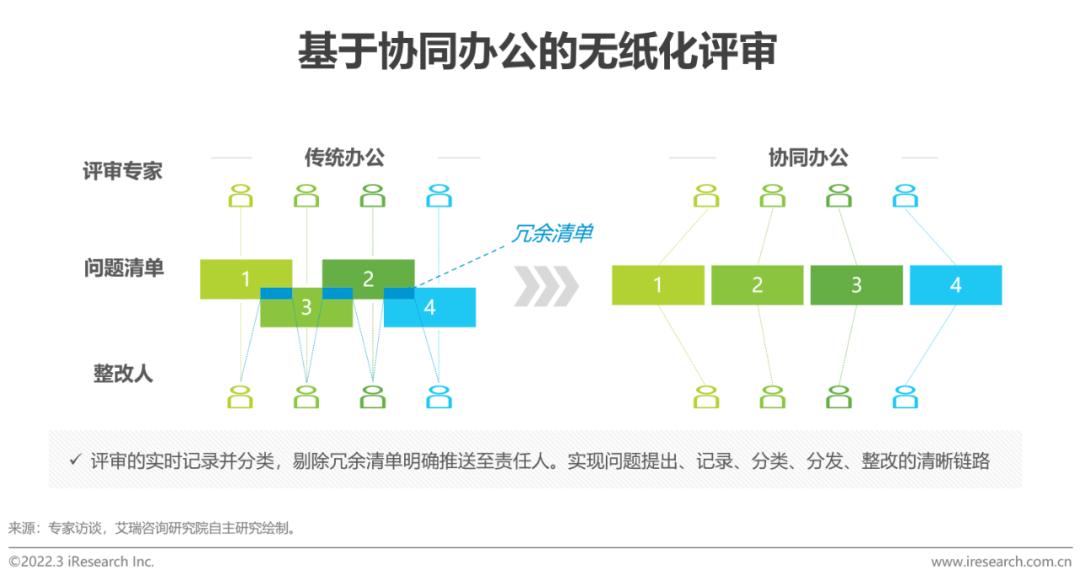 无纸化评审:评审过程中时常出现相似评审间的冗余问题,即不同评审专家提出相同问题,整改时需付出额外的沟通时间,甚至做出大量的无效整改。而基于协同办公的评审将问题在系统中实时记录,进行冗余问题的分类后推送至各整改人。冗余部分可被推翻、覆盖或仲裁,实现利用少量人工跟踪整个项目,降低出错风险,减少无效工作。