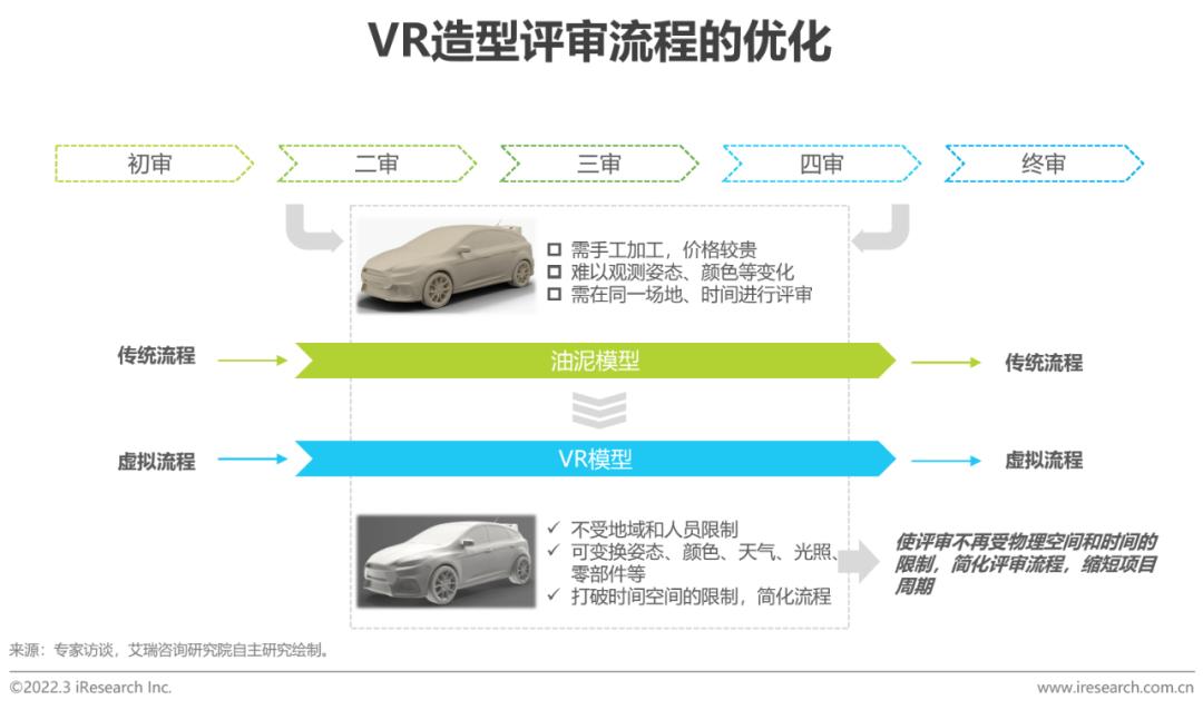 专业部门评审时通常会用到油泥模型判断设计策略与外观的一致性,最终确定造型方案。通常造型评审会做5-6次油泥模型,其制作耗时且昂贵,难以观测汽车的动态变化。而虚拟现实将评审流程简化,通过VR设备可清晰的展现效果图中未能清晰展现的部位,同时可提前判断姿态表现甚至内饰设计。虽然部分评审项目已全部将油泥模型更换为VR模型,但部分企业考虑到开模、制造工艺和可行性等,目前VR暂时难以完全替代油泥模型,因此部分项目在初审和终审阶段仍需使用油泥模型,而在中间的审核阶段使用VR模型。