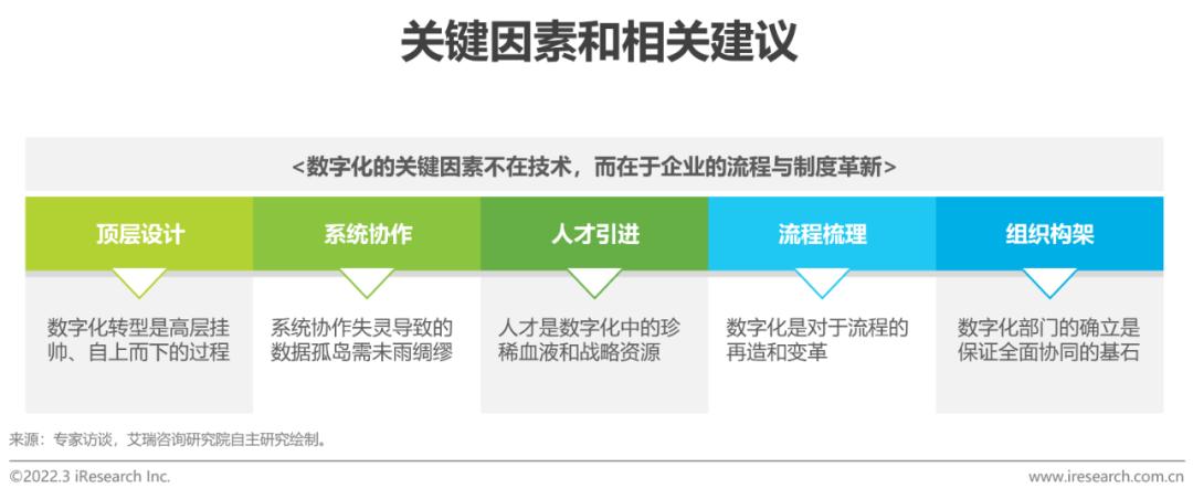 数字化前期的注意事项:1.数字化转型自上而下的过程;2. 数据孤岛需未雨绸缪;3.人才是数字化中的珍稀血液;4.数字化是对于流程的再造和变革;5.数字化部门的确立是保证全面协同的基石。