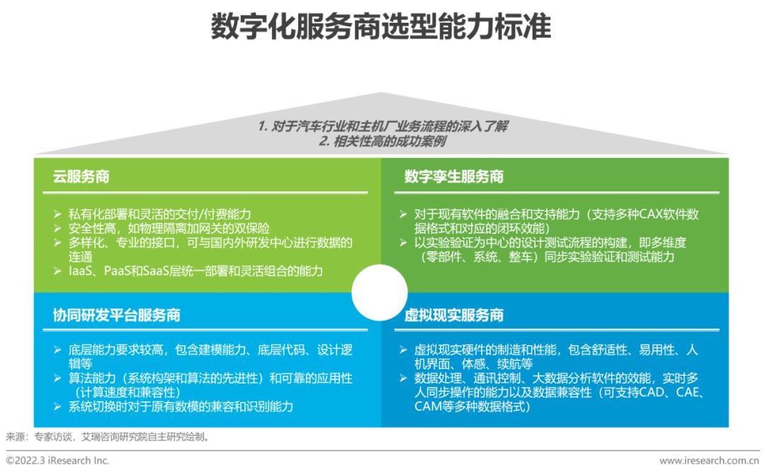 主机厂在云平台和数字孪生等技术上的应用仍处于探索前进的阶段,因此决策较为谨慎,会优先考虑其对于汽车行业的认知,和相关性高、可移植性高的成功案例。在云服务领域,多样的部署方案、安全性和连通性为主要的考虑因素。数字孪生领域对于现有软件的兼容、互认,和整车级别的虚拟化协同仿真能力成为选型主要标准。研发平台则更多的被国外厂商垄断,其包含了数学、物理等基础学科的应用,因此对底层能力要求较高。而主机厂对于虚拟现实的know how则相对较少,更加注重包含软硬件在内的整体能力。