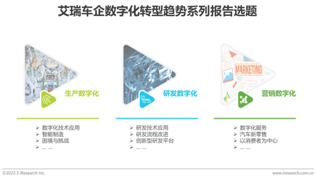 报告说明在我国朝着第二个百年奋斗目标迈进的同时,我国车企也正在实施一场由内向外的数字化变革,如啄喙断爪般在困境与机遇中迎来全新的发展阶段。艾瑞认为,车企的数字化转型升级将不仅仅是技术换代,而是从企业战略、组织构架、运营管理、生产制造到市场营销自上而下的全方位变革。为此,艾瑞特别推出车企数字化转型趋势系列研究报告,将分别在生产、研发和营销三方面展开深入讨论。艾瑞希望通过在汽车行业的积累和洞见,对正在进行数字化变革的车企和每一位汽车人提供参考,为正在经历百年未有之大变局的汽车行业提供绵薄之力。