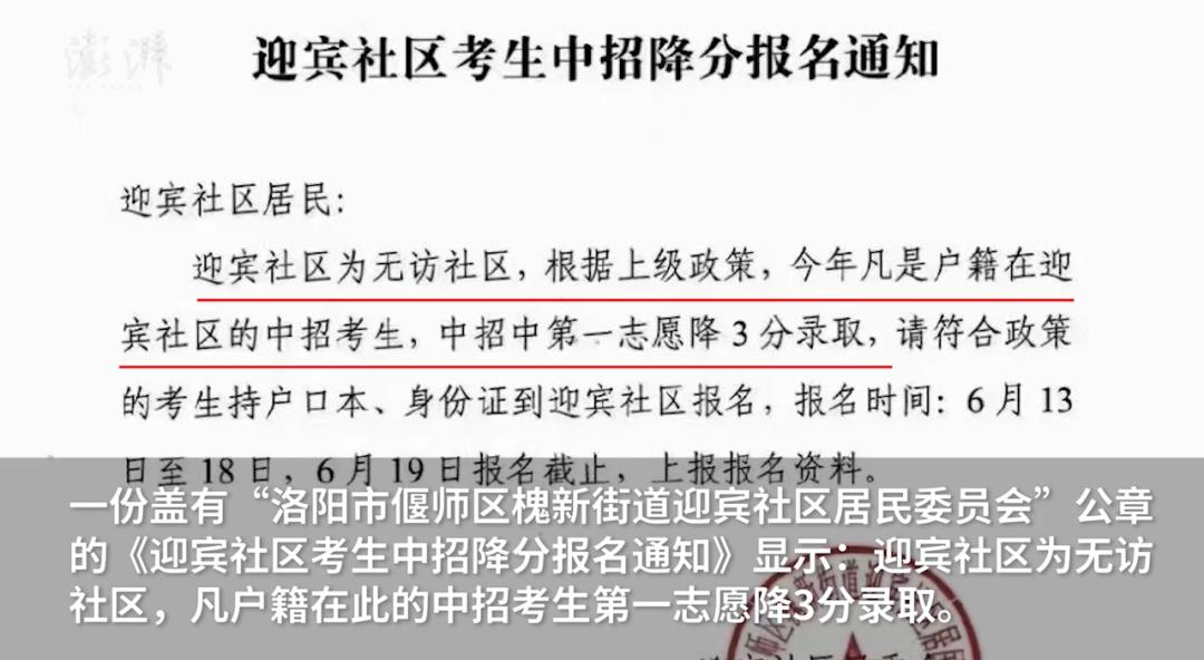 从发布的通知来看,这似乎是一份“喜报”,但对其他考生而言,却可能是个“噩耗”。通知显示,因迎宾社区被认定为无访社区,户籍在该社区的中招考生,皆“享受”第一志愿降3分的福利。
