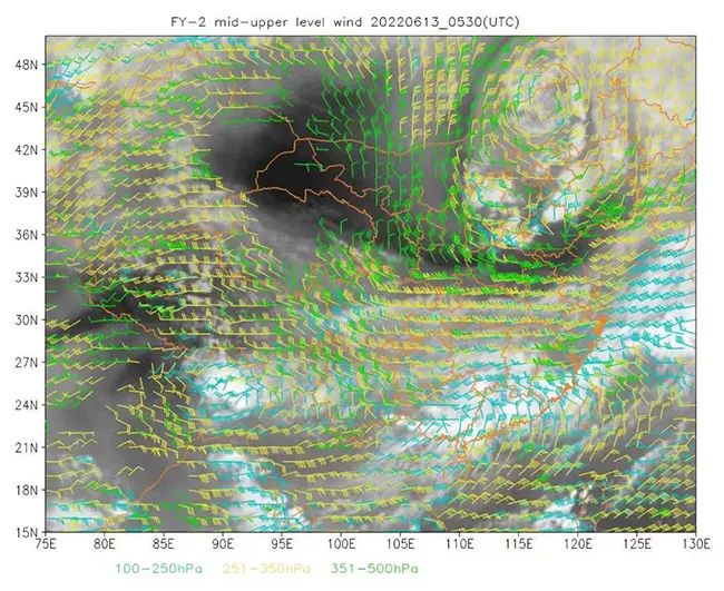 6月13日13:30时,风云二号卫星中高层云导风显示,东北冷涡南侧激发出来的强对流云团位于山西北部、河北、山东北部等地;广西、广东、福建等地位于南压高压东侧的高层辐散气流中,有利于产生降水。国家卫星气象中心供图