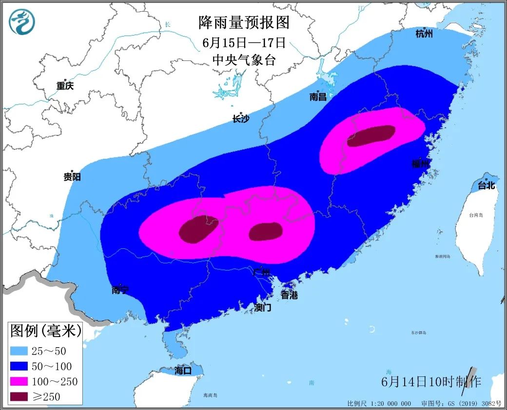 具体来看,6月15日至17日,广西大部、广东中北部、湖南东南部、江西东部和南部、福建西部和北部、浙江南部等地有大到暴雨,局地大暴雨,单点可能有特大暴雨;过程中还伴有短时强降雨,局地有雷暴大风、冰雹等强对流天气;上述地区累计降雨量有50~100毫米,其中,广西中北部、广东中北部、湖南南部、江西南部和东部以及福建北部等地累计降雨量120~200毫米、局地250~400毫米;最大小时降雨量40~60毫米、局地80毫米以上。6月18日至21日,华南中北部至江南大部还将有大到暴雨天气过程。22日之后,南方地区降雨将明显减弱。