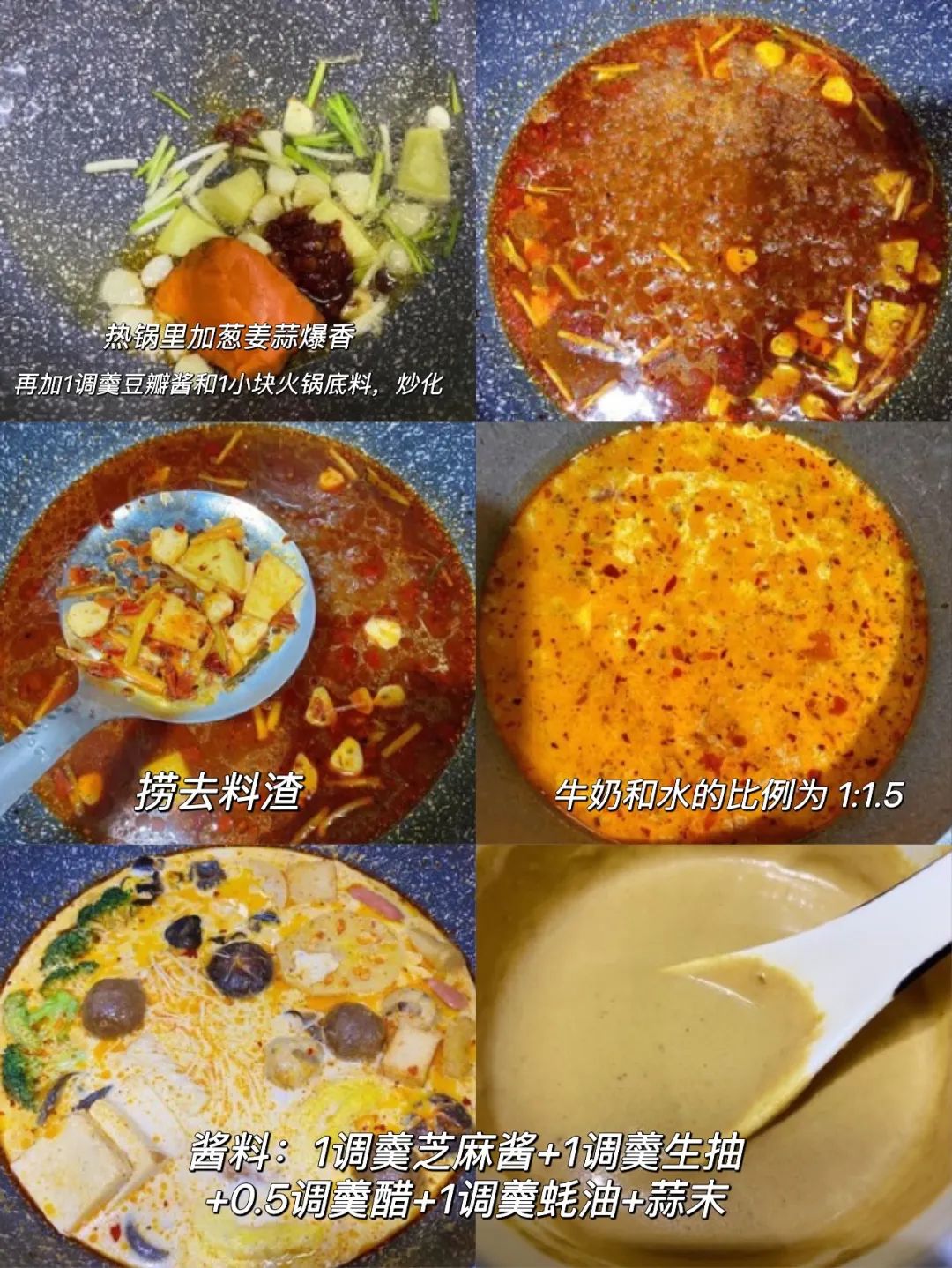 以下图片及做法参照 可截图保存 @lazy美食记1. 热锅中放入葱姜蒜、豆瓣酱和火锅底料,小火炒化。