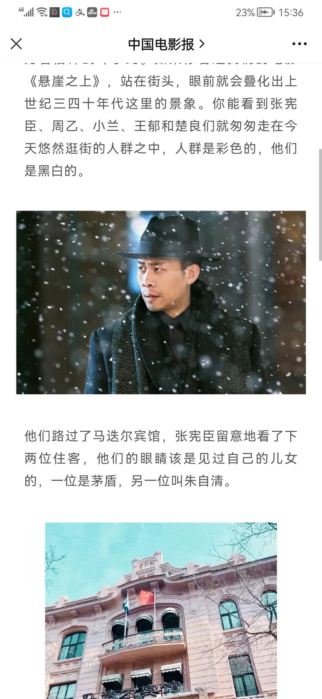 稀缺的建筑影像资源,承载一代人的回忆为了拍摄电影《悬崖之上》,张艺谋特意在外地建了一个中央大街外景地。哈尔滨演员张译在片中扮演一名红色特工,影片拍完后,张译在《中国电影报》上撰文说:“中央大街,是我小时候每天都要路过的地方。杀青之后,我回了一趟夏天的中央大街。一百多年来,有太多北方的潜行者行走于此,为着信仰战斗于此。如果你看过我们的电影《悬崖之上》,站在街头,眼前就会叠化出上世纪三四十年代这里的景象。你能看到张宪臣、周乙、小兰、王郁和楚良们就匆匆走在今天悠然逛街的人群之中,人群是彩色的,他们是黑白的。快到松花江边的地方,老张褪去了皮囊,我就被留在了这个新世界里。我好想上前抓住老张的手,请他们多停留片刻,问问他们,这个新世界的景象是否如您所愿?我想向当街的现代人们介绍老张,想来人们也会驻足脱帽。而老张们只会羞赧地点点头,嘱托我替他享受这里的美好生活,然后行色匆忙,继续向北去完成他们的任务。我眼睁睁望着他们消散的背影,泪流满面,如鲠在喉。”