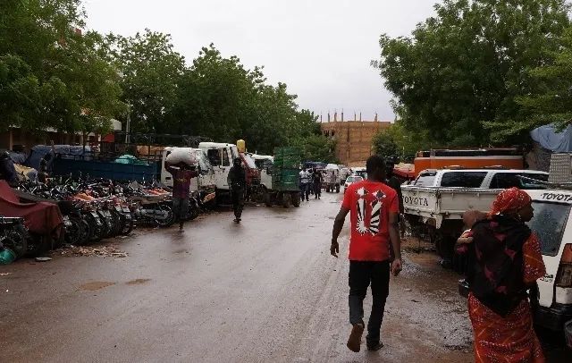 • 尼日尔街头景象拜访结束后,这位传统首领送我走出他的宫殿到门外沙土地上,早已聚集在这里的人群立即欢腾起来,以非洲人特有的尖音喉咙欢呼着、跳舞、打鼓,边舞边指手画脚,指天指地,喊些口号,沙土飞扬,热闹非凡。据说这是对传统首领出现时一种传统的欢迎方式,人们以见到传统首领为幸运,口中所喊,据说都是颂扬祝福之词。