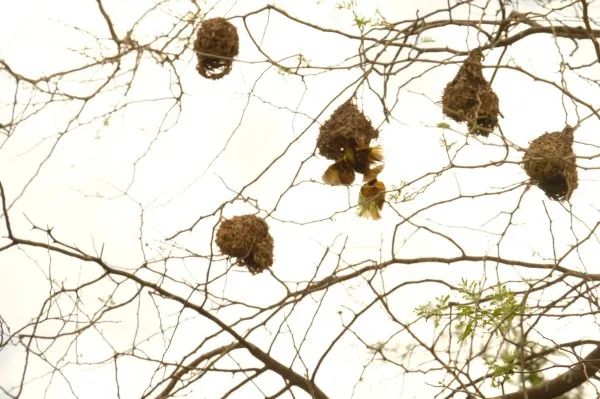 • 一棵树上有很多鸟巢我从心里佩服非洲人善良高贵的品德。我曾顺便到尼亚美附近一户居民家参观,院内有几棵高大的树,只见树枝杈上,布满着简陋不齐、大小不一、形式多样的鸟窠,乌鸦、喜雀、麻雀和一种白色而较大的鸟各据其位,竞相鸣叫,可以看到有的是因争夺地盘或保护其幼仔而相互追逐鸣叫着,声音嘈杂,但不是追逐打架。