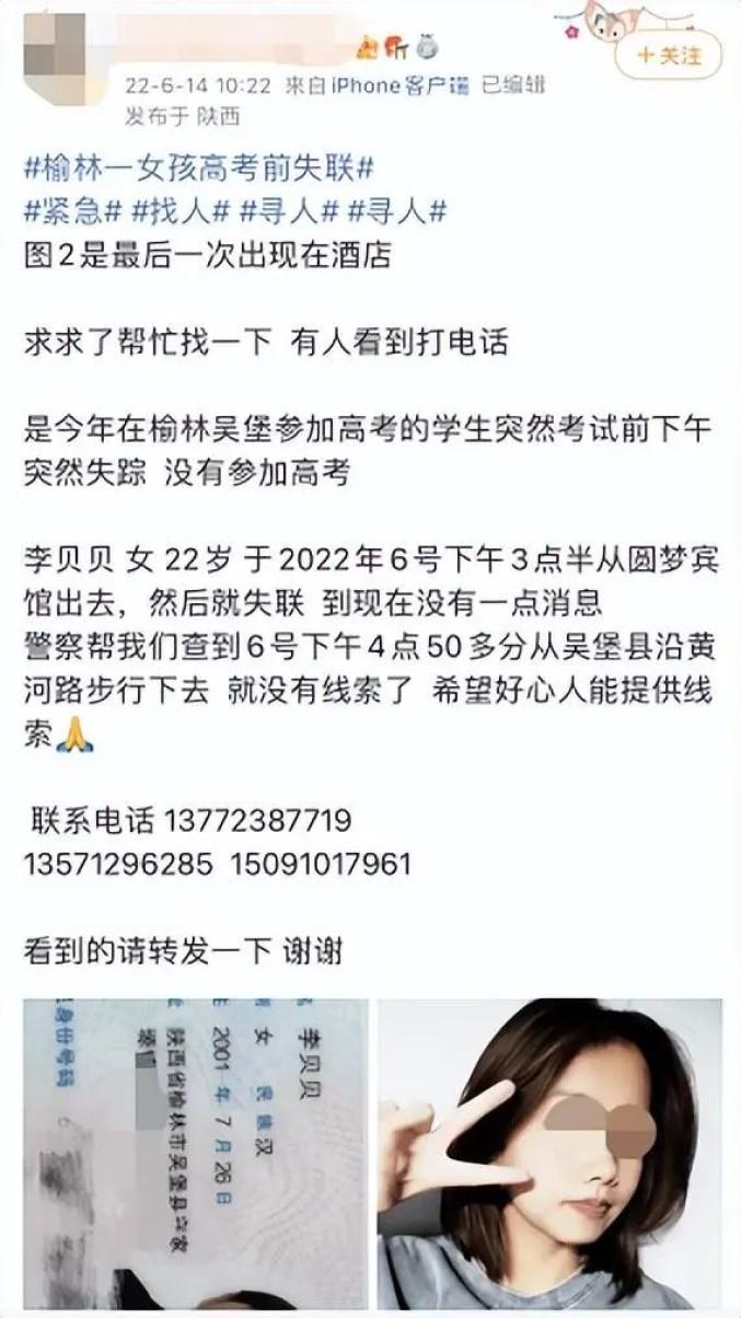 6月14日,陕西榆林,一则寻人消息引发关注。消息称,21岁女孩李贝贝今年本应在榆林吴堡县参加高考,但6月6日下午3点半从考点附近的圆梦宾馆出门后就失联至今,也没有参加高考。