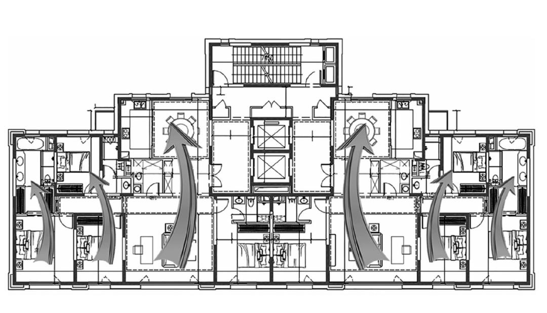 △通过简洁的建筑形体设计减少散热面和结构性热桥,降低热负荷。浅进深大面宽的设计,充分利用自然通风采光,满足冬季尽可能获取太阳辐射得热的需求