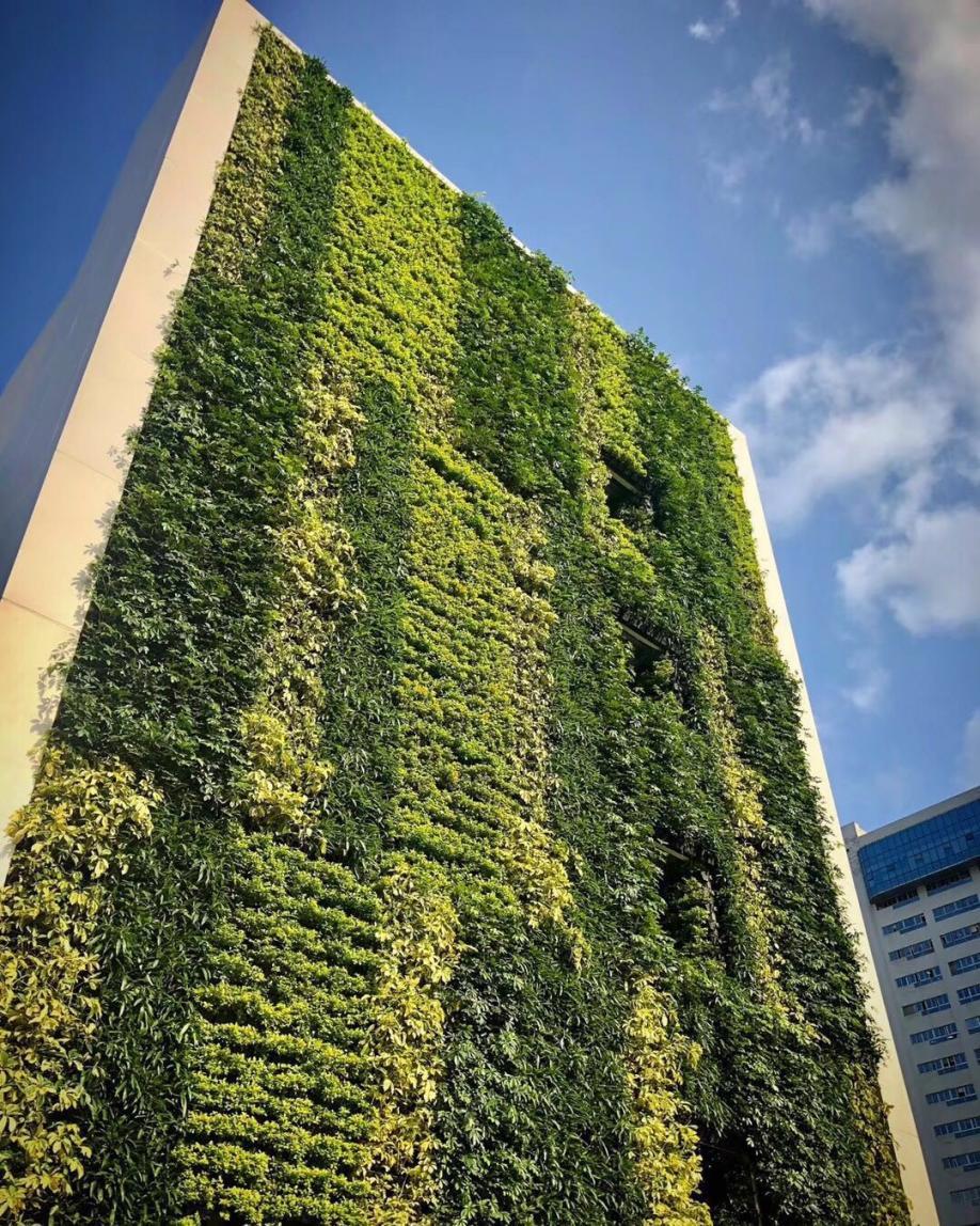 深圳位于夏热冬暖地区,东西向外墙受热多,项目采用墙面立体绿化可有效降低外墙表面温,进而降低空调能耗。考虑到外立面施工条件,项目选取南、北楼西侧进行立体绿化,绿化面积约340平方米。