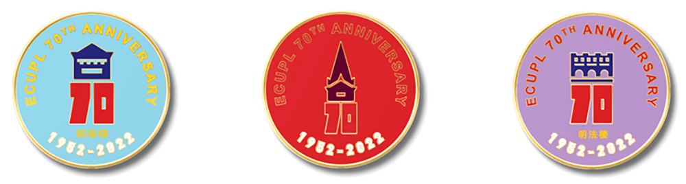 今年恰逢华东政法大学建校70周年。学校围绕70周年校庆,以别具特色的建筑作为创意来源,为毕业生精心设计了长宁校区和松江校区专属定制款纪念铜制徽章。徽章分为华政红,苏河青,玉泊紫三种,主要元素来自建校70周年系列图形,建筑图案的外形轮廓用白描金边勾勒。每个符号中的“70”像“基石”一样,稳稳托起华政园一座座追求真知的殿堂。