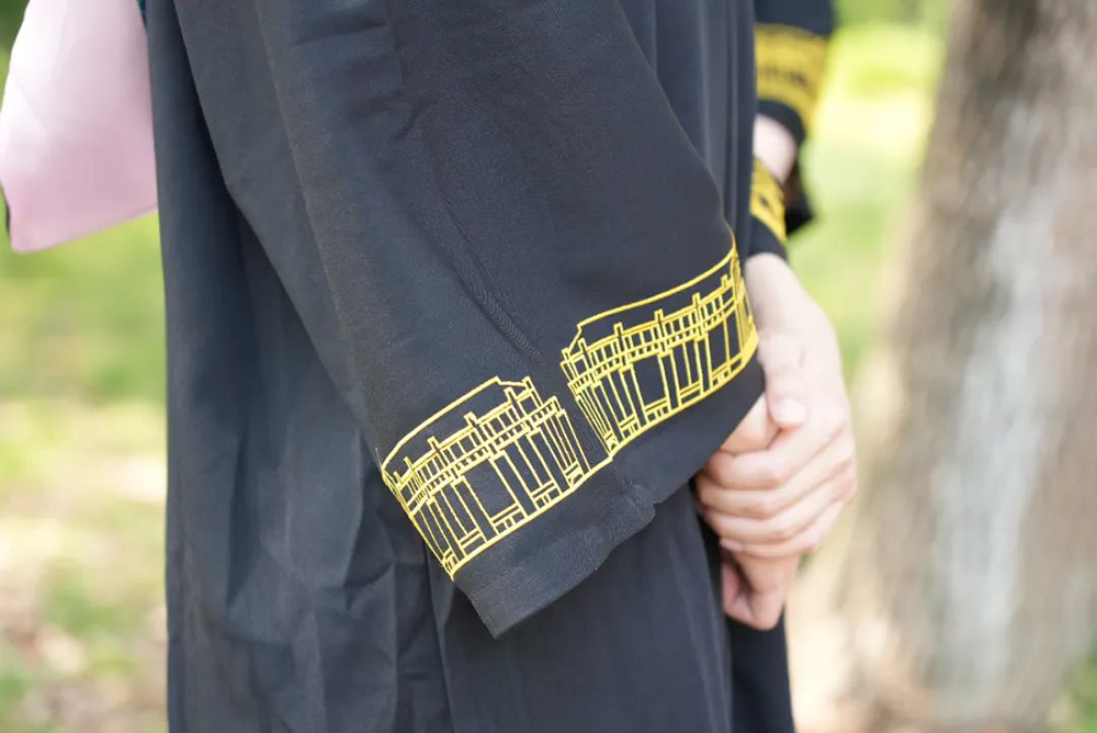 将华政独特的建筑形象纹于学位服袖口。