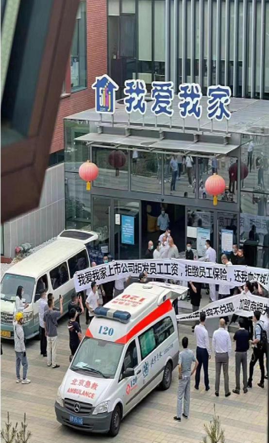 6月17日,一张关于我爱我家员工拉横幅讨薪的图片在社交媒体流传。从图片上来看,一条横幅写着“我爱我家上市公司拒发员工工资,拒缴员工保险,还我血汗钱!”、另一条则显示“……内容不兑现,加盟商损失……”。现场引来不少人围观,并停着一辆120救护车。