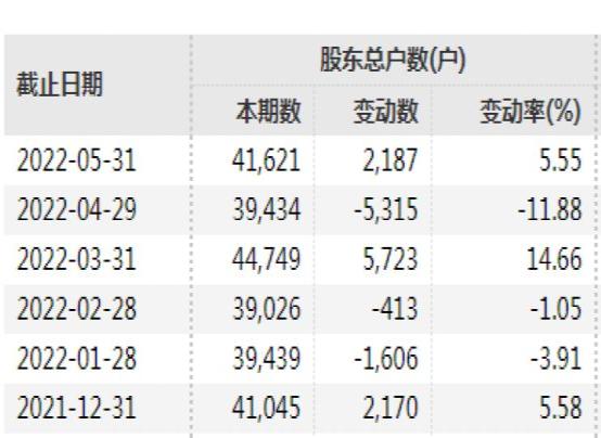 股东户数方面,今年以来我爱我家股东户数变动频繁。截至5月底,总户数为41621户,几乎与2021年底股东户数持平。