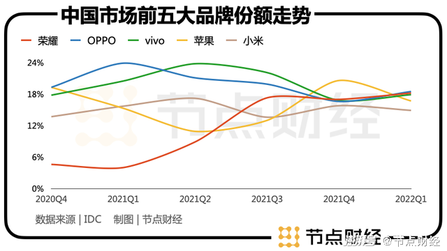 IDC数据显示,从功能机时代成功过渡至智能机时代的OPPO,已经连续五个季度成为中国市场第一名,2022Q1的市场份额为18.5%,在2021年Q1,OPPO的市场份额达到了23.5%的峰值。