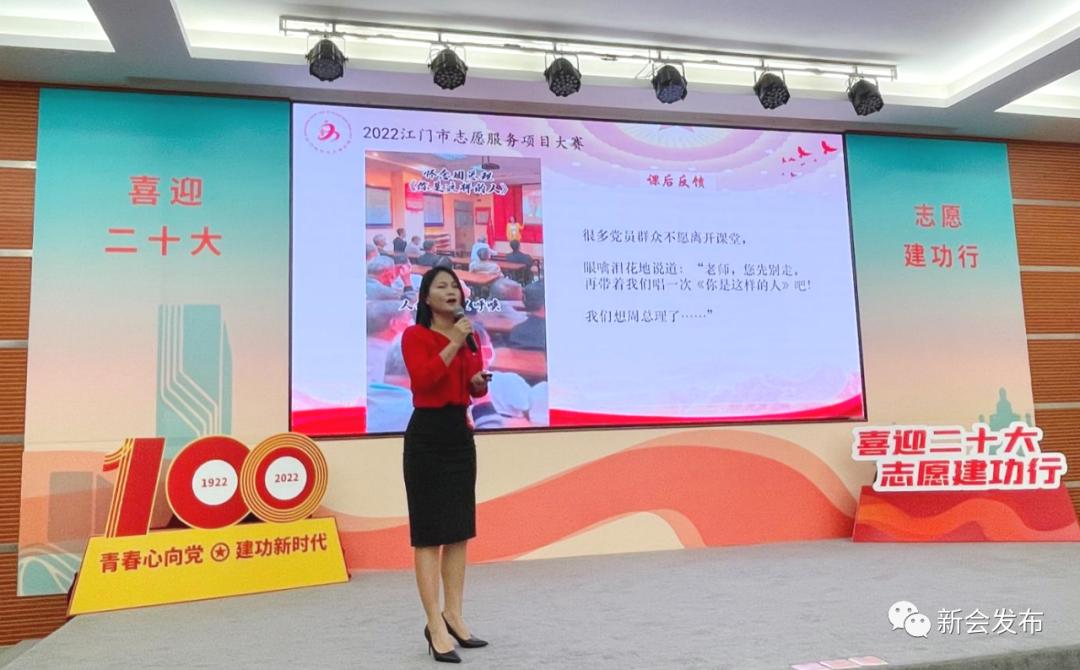 大赛当天,新会区新时代文明实践指导中心副主任陈晚翠代表新会区“永远跟党走·音乐党课”志愿服务项目在当天的路演中(5分钟演讲+3分钟答辩)表现出色,赢得现场专家学者们的一致肯定及盛情点赞,最终在全市37个志愿服务项目中脱颖而出,勇夺第一名,荣获“市级示范项目”殊荣!