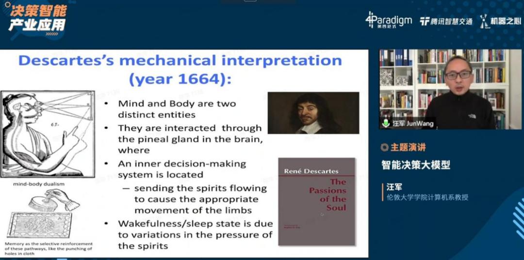 决策首先是决策,历史上笛卡尔在 17 世纪作为哲学家和数学家,就开始思考人是怎样做决策的。当然那时的科学还是比较落后的,给出的解释是比较机械的。大家都知道所谓的二元论观点,即在大脑里面,二元论观点认为有一个特定的器官:松果体。心灵和肉体之间有一个交互的地方,这个地方就是在大脑的松果体里。心灵是没法解释的,但是心灵可以控制人体行为动作,通过心灵的引导人类能够进行一些日常决策、行动等。以上是对人的决策解释。