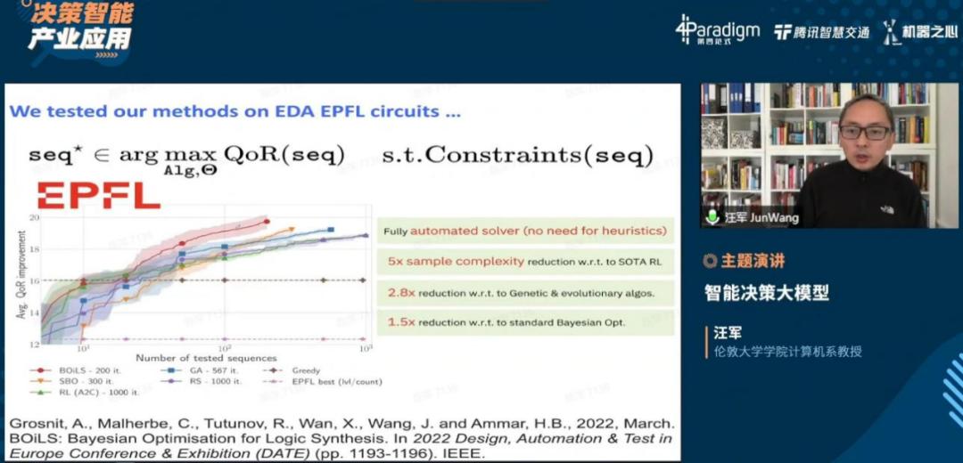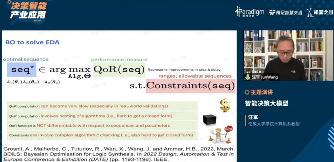我带领华为团队解决电子设计自动化 EDA 问题 时,我们用贝叶斯优化解决各种各样的 EDA 的问题。EDA 问题其实是一个离散优化 combination optimization 的问题,比如我们研究的一系列序列决策问题。我们在逻辑综合里面,想把整个的逻辑 数据转换成另一个 更实际的简化的逻辑实际,使它的逻辑功能完全不变,对于是否完全不变,我可以用 QoR 来横量它,QoR 值是多少,我是不知道的,我没有任何的数学表达,但是经过不断的试错,可以达到最优,但怎么提高试错效率?显然我就可以用刚才讲的贝叶斯黑盒优化,对 QoR 进行建模,然后去解决这个问题。