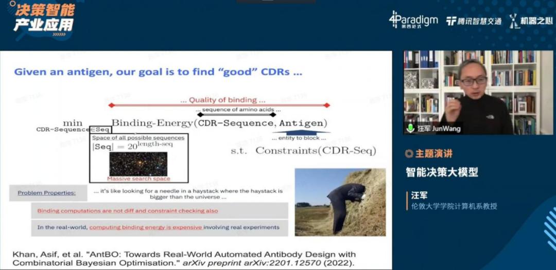 我再举另外一个例子,我想设计一个抗体能够抗击抗原,这两种蛋白质会发生一些反应。这里我们就要找出氨基酸的排列次序及其形成的蛋白质,使得 Binding-Energy 结合能最小化。使用穷举的方法几乎是不可能的,因为可能性空间太大了。小数据决策就需要贝叶斯优化了。
