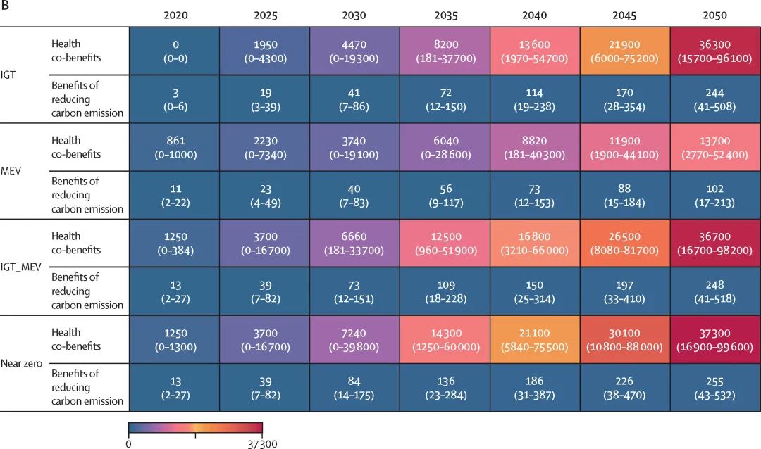 图1:四种交通减缓情景下分年龄和性别避免的死亡人数在四种交通减缓情景,近零情景每年实现了最大的健康和经济的协同效益,到2050年,相对于通用情景,可以避免300例(95% CI 229-450)死亡(图1),到2050年,货币量化的健康协同效益和减少二氧化碳排放的效益相当于北京2015年国内生产总值的0.01%(0-0.03%)(图2)。虽然在四种情景下,减少二氧化碳的效益在包含健康协同效益的总体效益中占比较小,但逐年在增加(图2)。通过比较四种交通减缓情景,发现相比于单一的交通减缓措施,采用绿色出行和电动汽车出行相结合的方式(IGT_MEV和近零情景)能够减少更多的碳排放与PM2.5污染,并产生最多的健康协同效益,其中绿色出行的增加起着至关重要的作用。